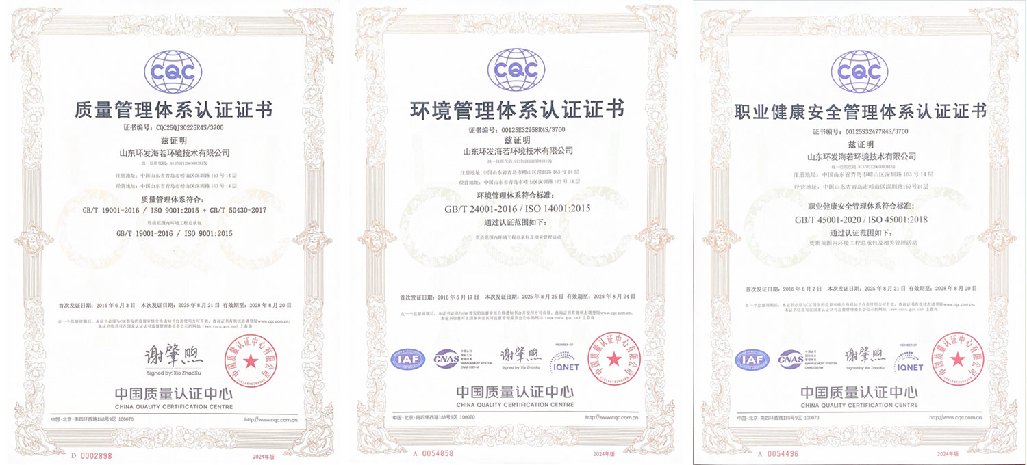 ? 近日,山東環(huán)發(fā)海若環(huán)境技術(shù)有限公司(以下簡(jiǎn)稱“環(huán)發(fā)海若”)經(jīng)過(guò)中國(guó)質(zhì)量認(rèn)證中心(CQC)專家組的多輪嚴(yán)格審核,順利通過(guò)質(zhì)量管理體系(ISO 9001)、環(huán)境管理體系(ISO 14001)、職業(yè)健康安全管理體系(ISO 45001)一體化再認(rèn)證,并正式獲得中國(guó)質(zhì)量認(rèn)證中心頒發(fā)的認(rèn)證證書。